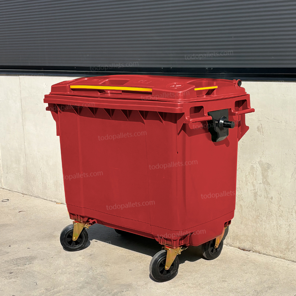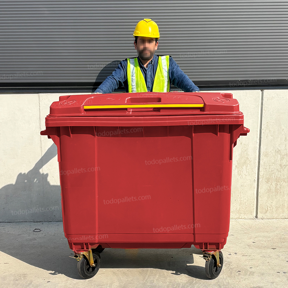 Contenedor de plástico de 1100 litros en color rojo, fabricado en HDPE moldeado por inyección de alta presión. Cuenta con cuatro ruedas de caucho sólido, dos de las cuales están equipadas con frenos para un manejo seguro. Su estructura reforzada permite la recolección mecanizada, y su material resistente a cambios de temperatura y productos químicos asegura una durabilidad prolongada.