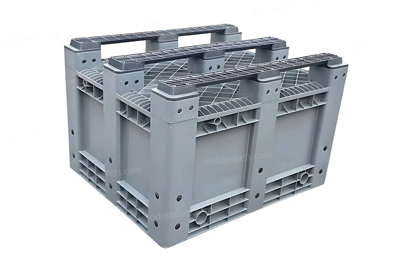 Su diseño robusto incluye patines integrados, lo que facilita el manejo con montacargas y patín hidráulico desde los 4 lados, asegurando máxima practicidad en entornos logísticos. Además, al no contar con bordes cortantes, garantiza seguridad al apilarse y manipularse.