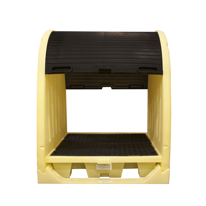 Gabinete de Seguridad para 4 Tambos Industriales resistente a químicos altamente corrosivos y a condiciones ambientales. Aprobado por Normas: EPA 40 CFR 264.175, SPCC, NPDES y UFC. Rejillas Removibles HDPE para su fácil limpieza, puertas corredizas con cerrojo de seguridad, entrada para montacargas.