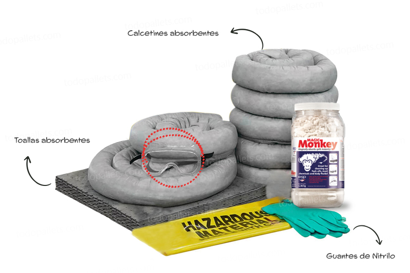 El contenido del kit está diseñado para absorber eficientemente una amplia gama de líquidos, lo que lo hace ideal para su uso en áreas propensas a derrames de sustancias químicas peligrosas. Incluye toallas absorbentes, calcetines absorbentes, absorbente granular, bolsas de desecho, guantes de nitrilo y goggles de seguridad, proporcionando todos los elementos necesarios para una respuesta efectiva ante emergencias.