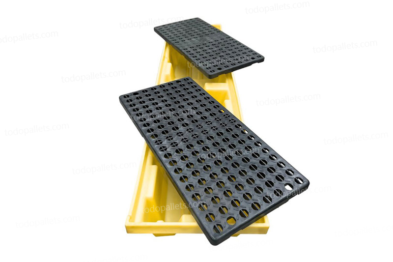 Tarima de plástico antiderrames para 4 Tambos Industriales en linea, resistente a químicos altamente corrosivos o peligrosos. Fabricada con PE (Polietileno) 100% Virgen de Alta Densidad (HDPE). Aprobada por Normas: EPA 40 CFR 264.175, SPCC, NPDES y UFC. Cuenta con capacidad de derrame de hasta 250 litros de acuerdo a Normas Internacionales. Diseñada para soportar 4 tambos industriales de 200 litros en línea, incluye 2 Rejillas HDPE removibles que facilitan su uso y limpieza.
